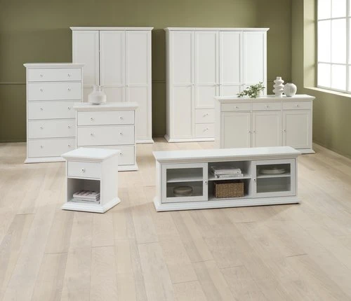 En panneau de particules, placage feuille. Pieds : plastique. Intérieur de garde-robe : 5 étagères et 1 tringle à vêtements. 3 portes. l140 x H200 x P64 cm