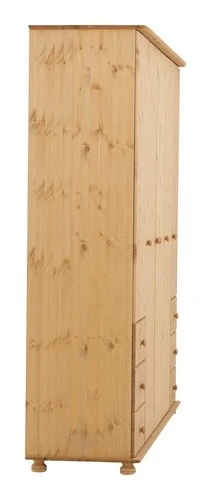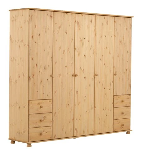 En pin massif. Huilé. Intérieur : 1 tringle à vêtements, 6 étagères. 5 portes, 6 tiroirs. l248 x H224 x P60 cm