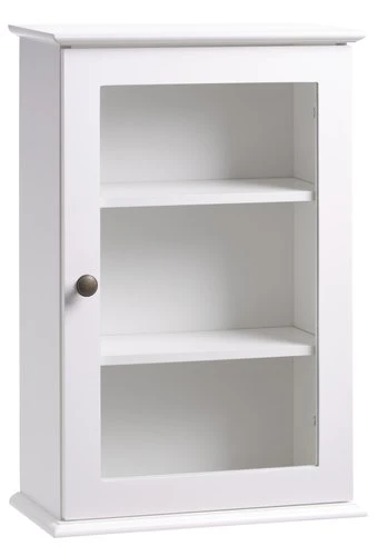 En MDF, papier, verre trempé et poignée en zinc. Vernis. l40 x H60 x P19 cm