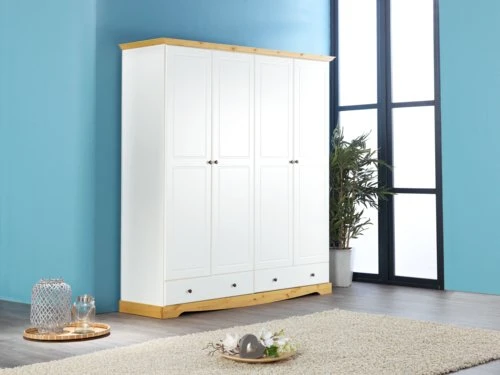 Pin massif et MDF (panneau de fibres moyenne densité). Intérieur de garde-robe : 4 étagères et 1 tringle à vêtements. l203 x H216 x P58 cm