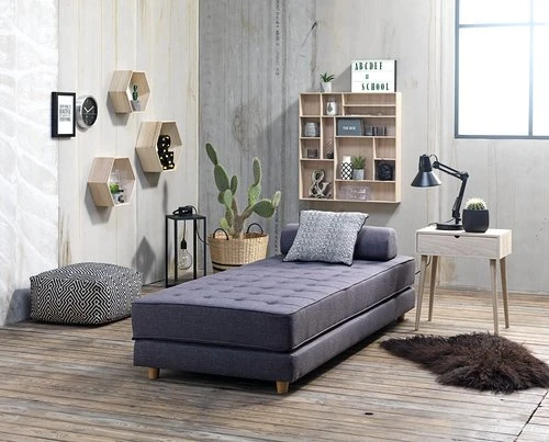 Structure : contreplaqué, eucalyptus massif, métal. Garnissage : mousse. Revêtement : polyester. Pieds : bois de caoutchouc massif. Couchage : 152×190 cm. l190 x H35 x P76 cm