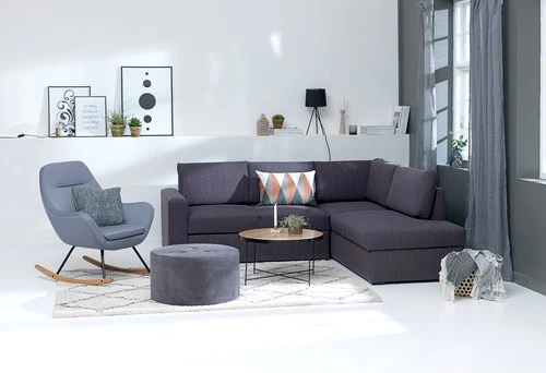 En MDF, lamibois, contreplaqué. Pieds : bouleau massif. Garnissage : mousse polyéther (25 kg/m³). Revêtement : polyester. Avec espace de rangement. Non réversible. 3 personnes. Couchage : 150×195 cm. l229 x H86 x P86/203 cm