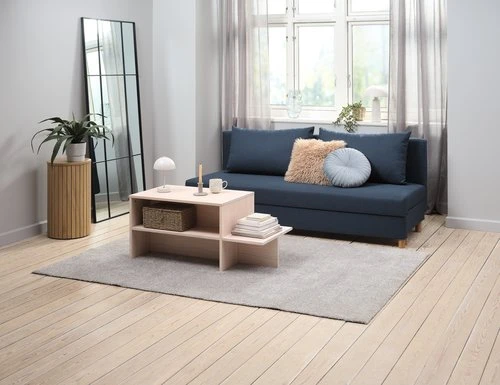 En panneau de particules, HDF, pin massif. Garnissage : mousse polyuréthane (28 kg/m³). Revêtement : polyester. Pieds : plastique ABS. 3 places. Avec espace rangement. Couchage : 130×192 cm. l192 x H83 x P83 cm