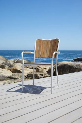 En acier galvanisé et bois d’acacia massif FSC® huilé. Empilable. l56 x H89 x P65 cm