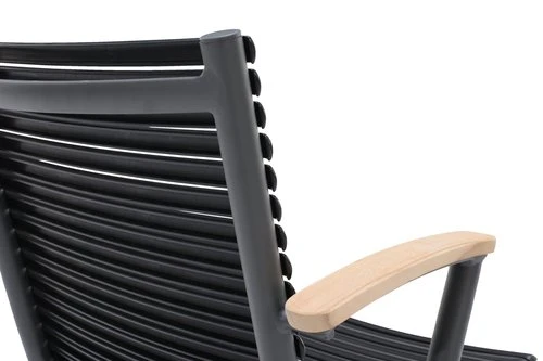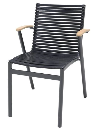Cadre : aluminium. Dossier, assise : polypropylène recyclé. Accoudoir : teck massif recyclé FSC®. Empilable. Protégé contre le rayonnement UV. l57 x H84 x P65 cm