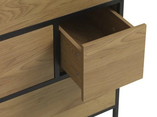 En MDF, panneau de particules mélaminé, plastique ABS. Cadre et pieds : acier. 4 tiroirs push-open. l70 x H75 x P40 cm