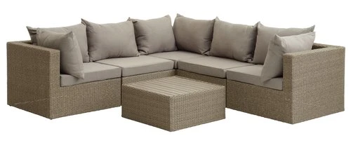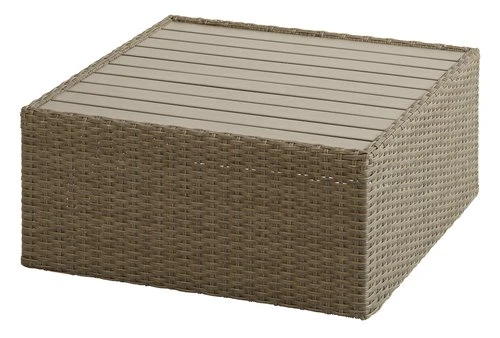 Cadre : polyrotin (polyéthylène), acier. Plateau : imitation bois (polystyrène). Module de table pour ensemble lounge modulable. l70 x L70 x H32 cm