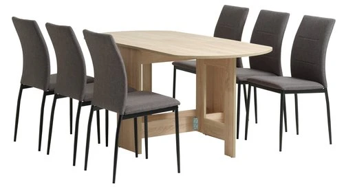 Table : plateau et pieds : panneau de particules mélaminé. Incl. 2 rallonges. La table peut être entièrement ou partiellement repliée. l80 × L36/100/163 × H76 cm. Chaise : structure : contreplaqué. Rembourrage : mousse polyuréthane. Revêtement : polyester. Piètement : acier. l44 x H92 x P53 cm