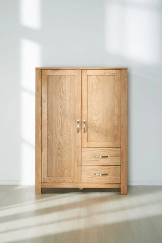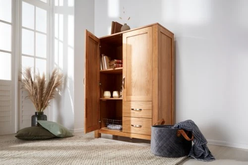 Chêne massif et placage chêne. Tiroirs avec glissières d’extension complète. l98 x H137 x P45 cm