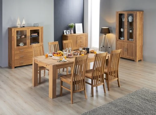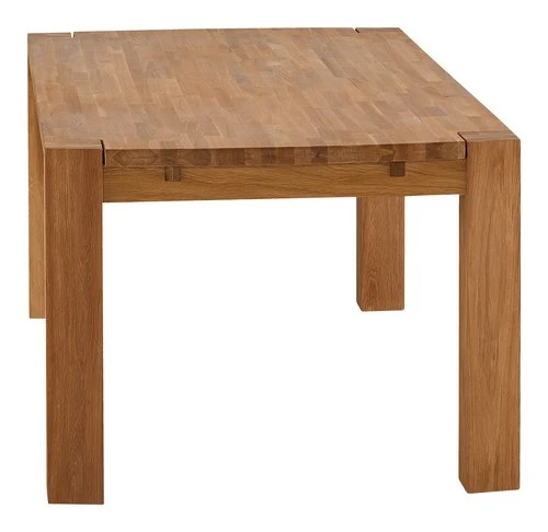 Plateau : chêne massif. Piètement : bouleau plaqué chêne. Finition huilée. Excl. rallonges. l100 x L200 x H75 cm