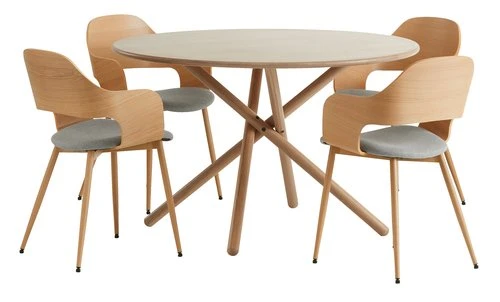 Table : panneau de particules, placage chêne, acier. Pieds : chêne massif. Vernis. Ø120 x H75 cm. Chaise : structure : contreplaqué peuplier/chêne. Rembourrage : mousse polyuréthane (25 kg/m³). Revêtement : 100% polyester. Piètement : acier. l52 x H79 x P51 cm