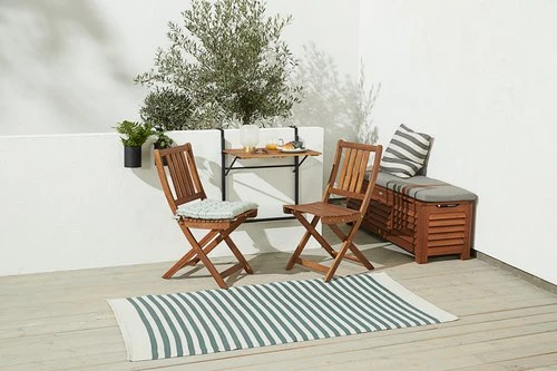 Cadre : acier galvanisé. Plateau : bois d’acacia FSC®. Avec vis pour ajuster la hauteur et la distance de la balustrade du balcon. Pliable. Finition huilée. Résiste au gel. l43 x L57 x H61 cm