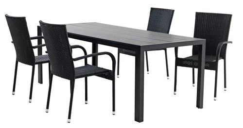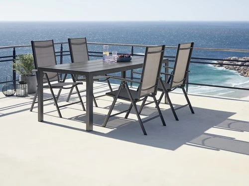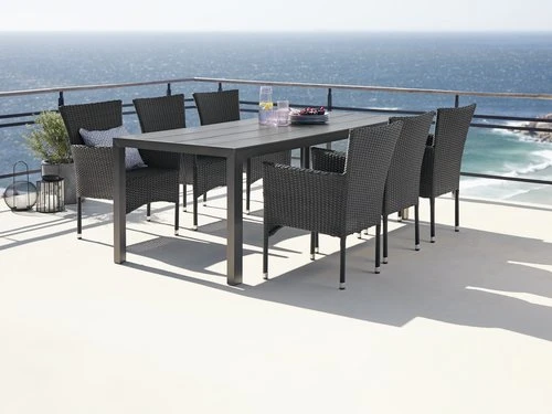 | Matériaux | Cadre: AluminiumL'aluminium est un matériel léger et élégant qui ne rouille pas. Il n'est pas nécessaire de le maintenir et le matériel est facile à nettoyer avec un chiffon humide., Dessus de table: Imitation bois (polystyrène)Cette imitation bois est faite à partir d’un matériau synthétique sans entretien dont la structure créé un effet de bois naturel. Elle est fabriquée à partir de plastique, tel que le polystyrène, qui constitue un matériau durable et résistant aux intempéries. Cette imitation bois est protégée contre les UV, ce qui garantit une surface dont la couleur ne change pas., Pieds: AluminiumL'aluminium est un matériel léger et élégant qui ne rouille pas. Il n'est pas nécessaire de le maintenir et le matériel est facile à nettoyer avec un chiffon humide. |